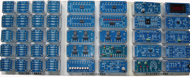 提供電工電子透明實訓模塊,可以完成直流電路、模擬電子技術、數(shù)字電子技術和電子綜合應用實訓項目。實訓模塊面板采用PCB板制作而成,器件和信號接口均已引至板上的專用插座,實訓模塊有四個彈性插腳,與專用實訓孔板配套使用。