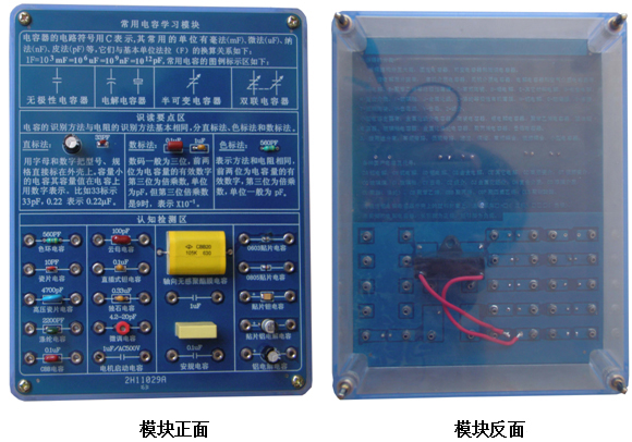 底盒使用190mm×145mm的開模有機透明塑料底盒,模塊面板采用印制電路板PCB工藝,可以直觀看到器件的實物及相關的原理介紹。對于典型應用及易損器件安裝在面板背面,透過透明底盒能夠看到器件實物,方便感性認識、檢測測試,同時也能防止器件的損傷。