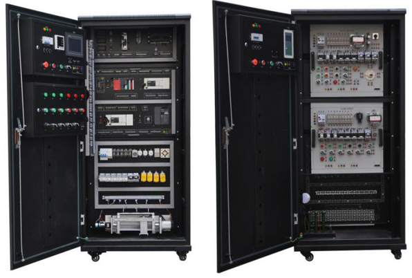 1.本裝置是由控制柜、受控對象等組成一個完整系統(tǒng),具有占地面積小、操作方便、可移動、內(nèi)部安裝有照明設施、操作面板,各控制點和通訊接口均引出到專用的接線板上,使實訓更加便捷。