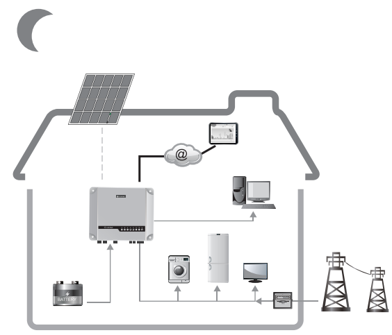 Ø 夜晚,光伏側(cè)直流停機(jī),由儲能電池通過儲能逆變器單獨(dú)給負(fù)載供電,當(dāng)電池剩余容量(SOC)放到設(shè)定值,系統(tǒng)自動切入電網(wǎng),由電網(wǎng)給負(fù)載供電,根據(jù)需求,電網(wǎng)可以通過儲能逆變器給電池充電,也可以不充電;