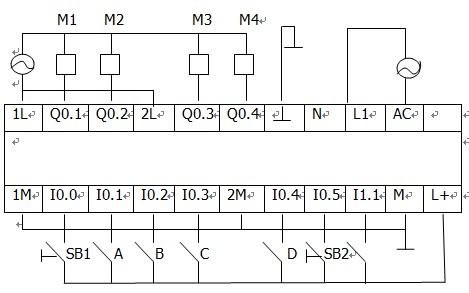 M1、M2、M3、M4分別接主機的輸出點Q0.1、Q0.2、Q0.3、Q0.4;SB1、SB2分別接主機的輸入點I0.0、I0.5;表示故障或重物設(shè)定的A、B、C、D分別接主機的輸入點I0.1、I0.2、I0.3、I0.4。啟動用按鈕SB1實現(xiàn),停止用按鈕SB2實現(xiàn)。故障或重物設(shè)置用撥動開關(guān)I1.1來模擬,電機的停轉(zhuǎn)或運行用發(fā)光二級管來模擬。