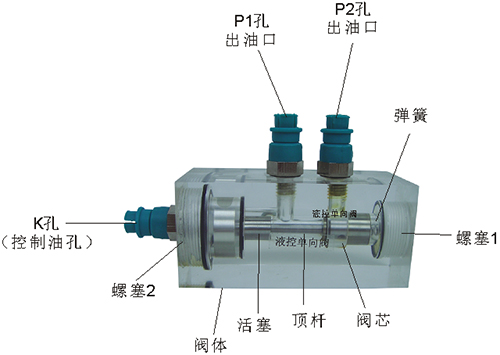 2、液控單向閥結(jié)構(gòu)上參考了國(guó)產(chǎn)IY-25B型液壓?jiǎn)蜗蜷y,其閥體、螺塞等采用了進(jìn)口透明有機(jī)玻璃材料精制而成,閥芯、頂桿采用了45#中碳鋼材料,并配合彈簧,油接頭,密封圈等標(biāo)準(zhǔn)件裝配而成,通過(guò)它可明確地觀察到活塞、彈簧、油孔等結(jié)構(gòu)及其運(yùn)行過(guò)程,具有形象逼真,性能可靠等優(yōu)點(diǎn)。它即可作為教學(xué)模型,也可以作為液壓實(shí)驗(yàn)元件進(jìn)行實(shí)驗(yàn)演示。