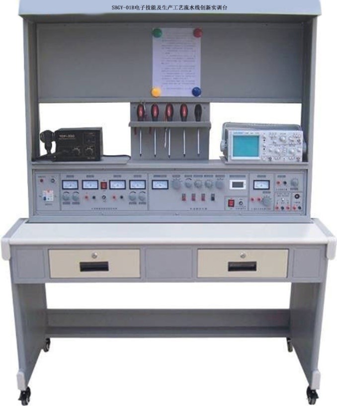 1、電子產(chǎn)品焊接實訓臺上方裝有照明日光燈1個、PVC板2個、三芯雙聯(lián)插座4個、兩芯插座2個、中間是看板、儀表臺、插座、工具柜、電烙鐵和元件盒,桌面配一塊絕緣膠皮。