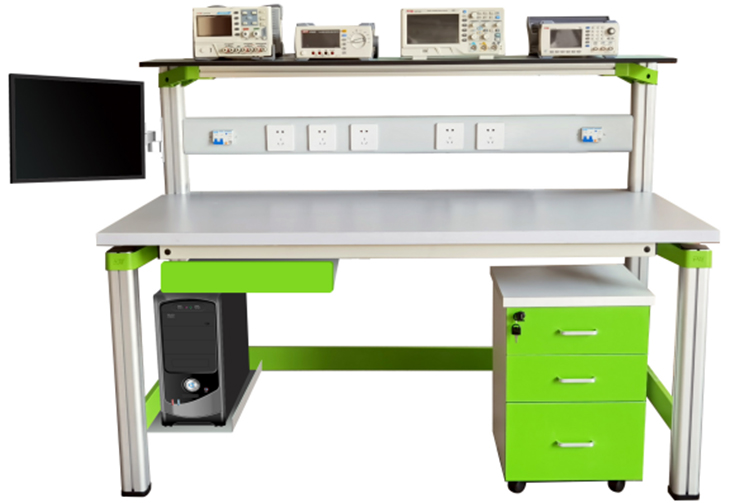 實(shí)訓(xùn)桌規(guī)格為1400(長(zhǎng))*700(寬)*1150(高),設(shè)有一個(gè)鍵盤(pán)托一個(gè)抽屜,桌子下部靠后右邊有一個(gè)電腦主機(jī)箱托。實(shí)驗(yàn)桌主體結(jié)構(gòu)全部采用高性能表面氧化的鋁型材及一次成型鋁壓鑄框架連接構(gòu)件,連接構(gòu)件采用壓鑄成型工藝(非焊接工藝),經(jīng)機(jī)加工、拋丸、噴砂,表面靜電噴涂工藝,安裝方便、快捷,用戶(hù)可自行DIY組裝。桌體立柱采用工業(yè)鋁型材成型工藝,表面氧化處理,截面尺寸:70mm×70mm,四面帶槽,槽寬約8mm,端部裝有注塑成型配套塑料堵頭。桌面采用25mmE1級(jí)三聚氰胺飾面板,桌面板下設(shè)支撐框架,承受力不少于300kg。配備儲(chǔ)存柜,存放元件及工具,儲(chǔ)存柜底部4只高強(qiáng)度萬(wàn)向可制動(dòng)PU腳輪,方便移動(dòng)。實(shí)訓(xùn)裝置整體簡(jiǎn)約不簡(jiǎn)單,高端大氣,符合現(xiàn)代化產(chǎn)品審美和發(fā)展趨勢(shì)。