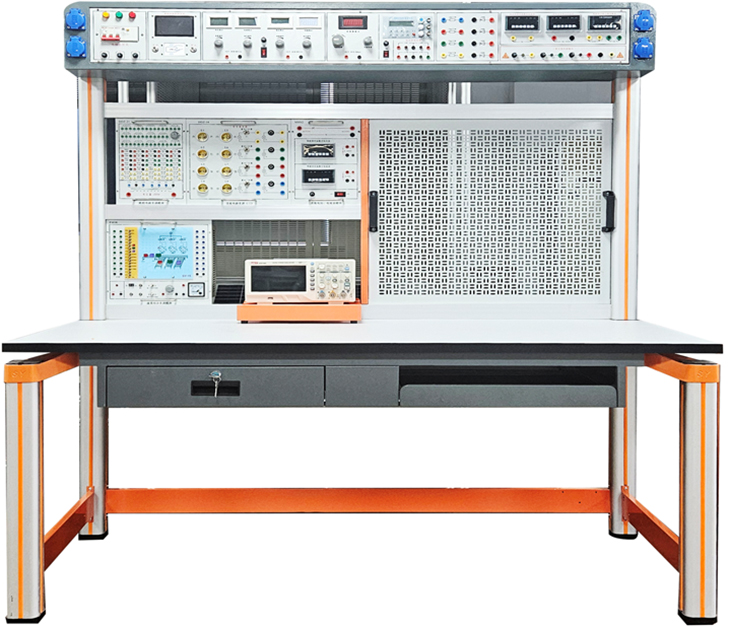 實驗桌后面二支桌腳向上延伸,配上特制拉模成型的帶滑槽橫梁鋁型材組成實訓(xùn)屏,實訓(xùn)時左邊放置電氣實訓(xùn)掛箱(2層)及示波器支架,右邊裝置網(wǎng)孔板等,實訓(xùn)掛箱、網(wǎng)孔板在實訓(xùn)屏上實訓(xùn)時上下方便,左右移位自如。實訓(xùn)屏頂部安裝主機箱,實訓(xùn)屏底部安裝實驗儀器工作電源箱。