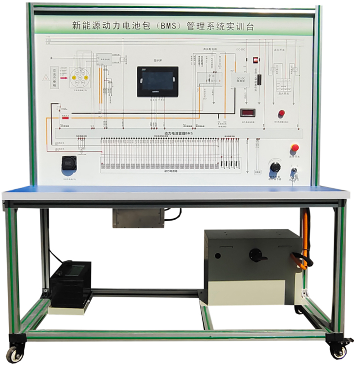 磷酸鐵鋰動力電池包與鐵制電池箱(單體電池3.2V 20AH,24串)、BMS鋰電管理一體機、動力電池包觸摸顯示屏、車載充電機、國標(biāo)充電插口、國標(biāo)充電槍、緊急斷電開關(guān)、霍爾電流傳感器、直流接觸器(包含充電繼電器、總正繼電器、總負(fù)繼電器、預(yù)充繼電器)、DC-DC轉(zhuǎn)換器(72V-12V30A)、輔助蓄電池(12V45AH)、放電控制繼電器與放電負(fù)載電阻、預(yù)充電阻器、可移動實訓(xùn)臺(1500×700×1700mm 帶自鎖腳輪裝置,帶安裝檢測端子的原理面板,面板1448×940mm)、故障模擬與排除裝置、設(shè)備操作說明書。