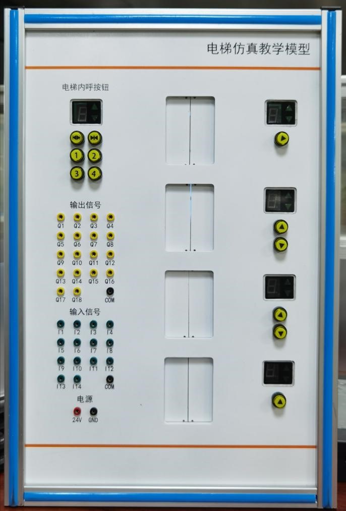 電梯仿真教學(xué)模型,電梯實(shí)訓(xùn)系統(tǒng)由機(jī)械傳動(dòng)和電氣控制兩部分組成,機(jī)械部分控制門的開,閉和轎箱的上下移動(dòng);控制部分由PLC控制各項(xiàng)功能開關(guān)和指示燈,以完成電梯的各項(xiàng)動(dòng)作。