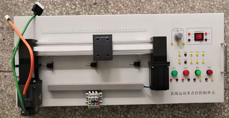 11.小車運(yùn)動(dòng)控制實(shí)訓(xùn)裝置(實(shí)物):由運(yùn)動(dòng)小車、滾珠絲桿傳動(dòng)機(jī)構(gòu)、伺服電機(jī)及驅(qū)動(dòng)器、光電傳感器、接近開關(guān)、開關(guān)電源等組成,通過傳感檢測、PLC編程,實(shí)現(xiàn)傳動(dòng)控制、鍵值優(yōu)化比較行走控制、定向控制、定位控制、加減速控制、報(bào)警運(yùn)行控制、點(diǎn)動(dòng)控制、位置顯示控制,該系統(tǒng)外觀精美,體積緊湊,重量輕,堅(jiān)固又相對(duì)精巧,行程范圍:0.6米,裝有4只光電傳感器、5只接近開關(guān)和2只行程開關(guān)進(jìn)行位置反饋。