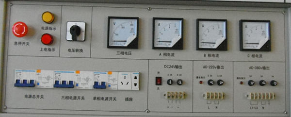 采用三相五線(xiàn)交流電源供電,帶有漏電保護(hù)、急停按鈕等保護(hù)措施;具有電源指示燈和供電指示燈;帶有電壓表、電流表,可以實(shí)時(shí)檢測(cè)裝置的電壓、電流;帶有三相電源輸出、單相電源輸出、DC24V電源輸出。
