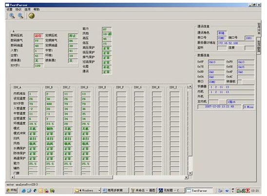 中央空調(diào)機由于工程復雜,設(shè)備分散,有的已經(jīng)裝修在開花板上測試程序,一但出現(xiàn)了故障,工程量相當大,為了能夠快速準確地測出故障是由主機機組還是室內(nèi)機的故障的,每個生產(chǎn)廠家根據(jù)生產(chǎn)的和維修的需要而開發(fā)了中央空調(diào)測試程序。可測試壓縮機的運轉(zhuǎn)頻率,傳感器的各種數(shù)據(jù),電子膨脹閥的工作步數(shù)等幾十種中央空調(diào)的工作數(shù)據(jù)和狀態(tài),軟件可實現(xiàn)對內(nèi)機的控制,,可以對1-64臺內(nèi)機的狀態(tài)進行設(shè)定。是高校提供了好的研究的學習設(shè)備。