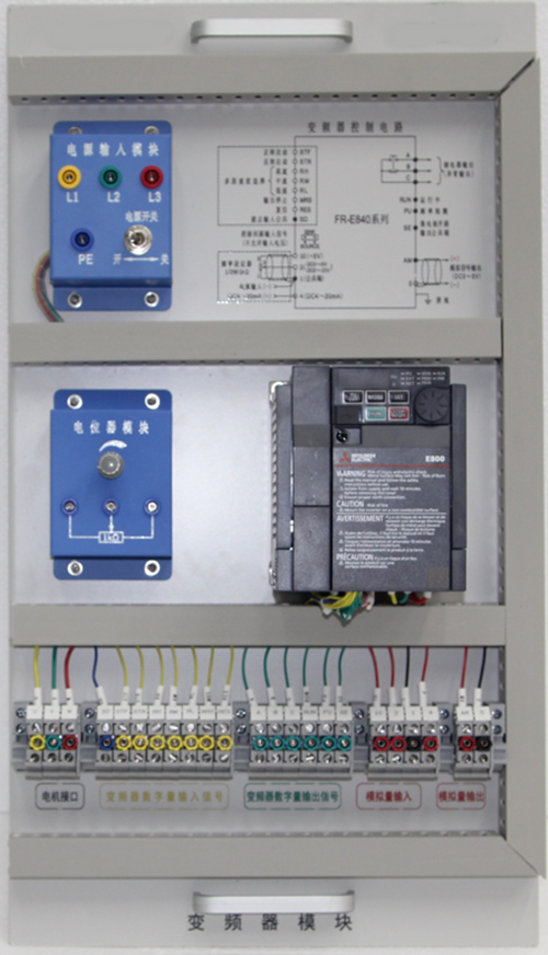 5)電源輸入模塊,強(qiáng)電、弱電采用不同型號連接柱分開插拔,避免插錯電源,引起變頻器的損壞。配合電源控制屏的電源輸出,可實現(xiàn)自由通斷。
