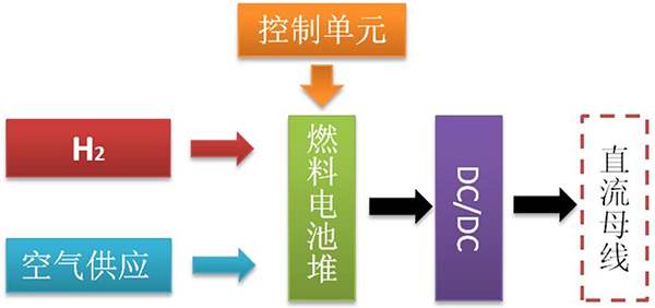 其工作原理是風(fēng)力、光伏發(fā)電系統(tǒng)發(fā)電,并由電池儲(chǔ)能,由儲(chǔ)能逆變系統(tǒng)轉(zhuǎn)換成交流電后接入電網(wǎng),燃料電池單元所發(fā)的電能經(jīng)DC-DC轉(zhuǎn)換后送入直流總線作后備儲(chǔ)能;系統(tǒng)可離網(wǎng)運(yùn)行亦可并網(wǎng)運(yùn)行,在網(wǎng)端能耗負(fù)荷內(nèi)完成削峰填谷功能。