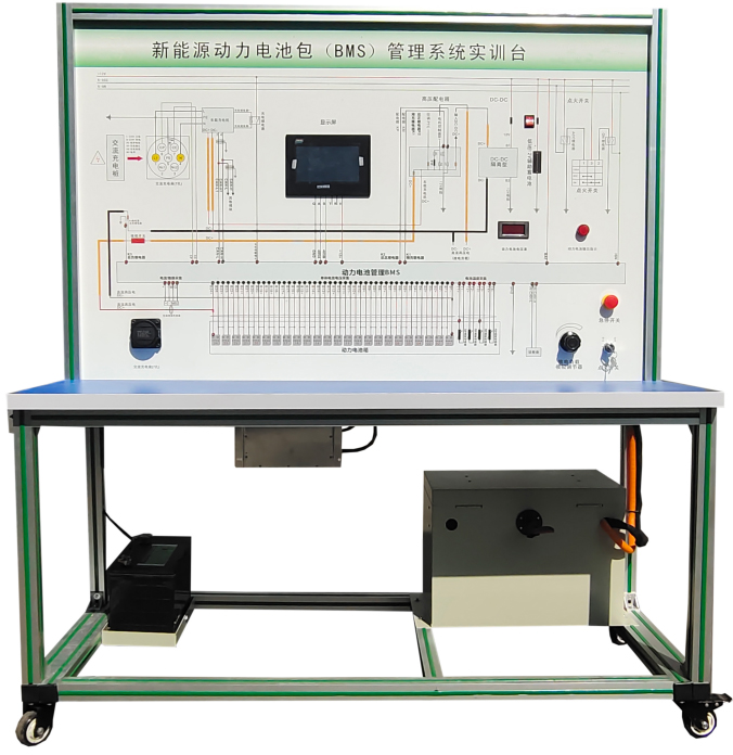 磷酸鐵鋰動(dòng)力電池包與鐵制電池箱(單體電池3.2V 20AH,24串)、BMS鋰電管理一體機(jī)、動(dòng)力電池包觸摸顯示屏、車載充電機(jī)、國標(biāo)充電插口、國標(biāo)充電槍、緊急斷電開關(guān)、霍爾電流傳感器、直流接觸器(包含充電繼電器、總正繼電器、總負(fù)繼電器、預(yù)充繼電器)、DC-DC轉(zhuǎn)換器(48V-12V30A)、輔助蓄電池(12V45AH)、放電控制繼電器與放電負(fù)載電阻、預(yù)充電阻器、可移動(dòng)實(shí)訓(xùn)臺(tái)(1500×700×1700mm 帶自鎖腳輪裝置,帶安裝檢測(cè)端子的原理面板,面板1448×940mm)、故障模擬與排除裝置、設(shè)備操作說明書。
