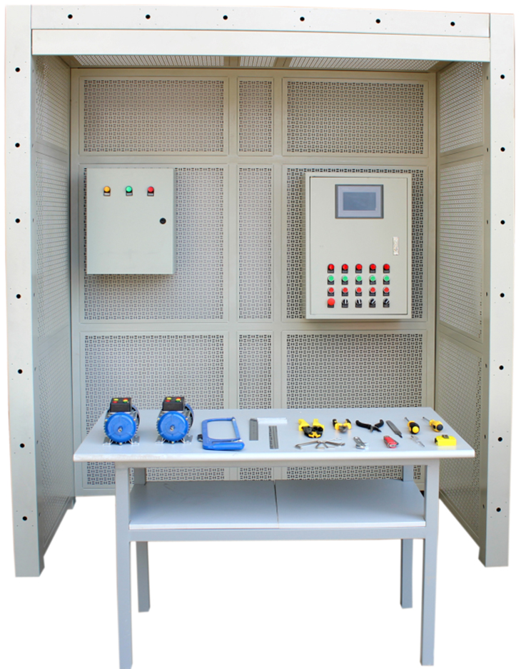 本設(shè)備可進(jìn)行電工安裝。如橋架安裝、PVC管安裝、吊燈、白熾燈座、日光燈、開關(guān)、插座、配電箱、控制箱等,裝置還包含有交流異步電動機(jī)、直流電動機(jī)、步進(jìn)電機(jī)、伺服電機(jī)、溫度控制器、電偶、PLC、變頻器觸摸屏、消防聯(lián)動、防盜報(bào)警、視頻監(jiān)控等控制與受控對象。該系統(tǒng)每個(gè)操作組配套一可移動式工具車和元件柜,便于對元件的保管和安裝施工。從根本上解決了學(xué)校在普通墻面上進(jìn)行的安裝培訓(xùn)的使用不方便、實(shí)訓(xùn)范圍窄的問題