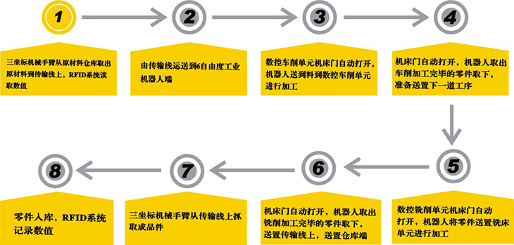 三坐標(biāo)機(jī)械手臂從原材料倉庫取出原材料到傳輸線上,RFID系統(tǒng)讀取數(shù)值,由傳輸線運(yùn)送到6自由度工業(yè)機(jī)器人端,由負(fù)責(zé)數(shù)控機(jī)床的上下料工作,數(shù)控車削單元將零件加工完畢后,機(jī)床自動開門,零件由機(jī)器人送置到數(shù)控銑削加工中心進(jìn)行加工下一道工序,加工完畢后銑床自動開門,由機(jī)器人取出成品零件送置到傳輸帶上,輸送到智能倉庫端,由三坐標(biāo)機(jī)械手臂將成品零件入庫,RFID系統(tǒng)讀取數(shù)值。學(xué)生在熟練掌握該系統(tǒng)的操作與編程以后,也可以對零件類型和加工工藝進(jìn)行調(diào)整。