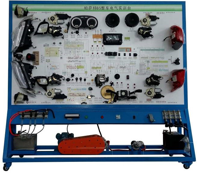 2.設(shè)備面板采用耐創(chuàng)擊、耐污染、防火、防潮的高級(jí)鋁塑板,表面經(jīng)特殊工藝噴涂底漆處理;面板打印有永不褪色的彩色電路圖;學(xué)員可直觀對(duì)照電路圖和實(shí)物,認(rèn)識(shí)和分析汽車整車電器各系統(tǒng)的工作原理。