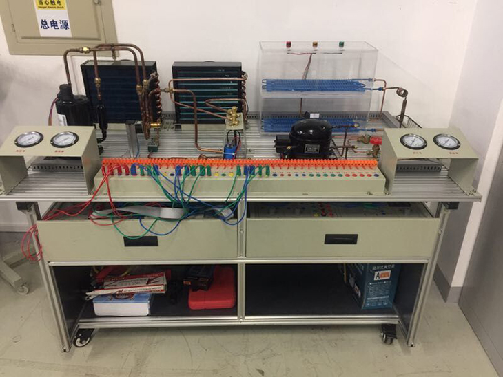 1、實訓臺采用鋁型材臺架加實訓模塊結(jié)構(gòu),裝置采用一體化設計,由導軌式鋁合金安裝平臺、空調(diào)系統(tǒng)、電冰箱系統(tǒng)、電氣控制系統(tǒng)等組成。底部安裝有四個帶剎車的腳輪,可以方便的移動和固定。設備配置空調(diào)制冷系統(tǒng)管路1套、直冷電冰箱制冷系統(tǒng)管路1套、安全插端子排,壓力表(1.5MPa)