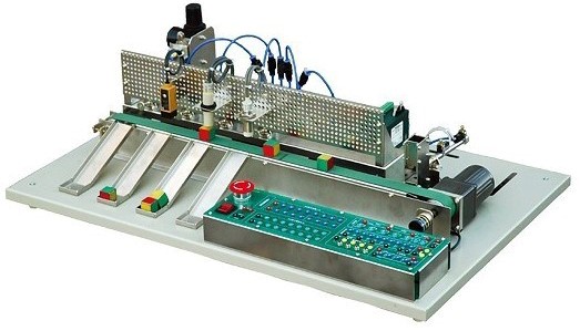 材料分揀模型采用臺(tái)式結(jié)構(gòu),配有PLC 主機(jī)、單相交流電動(dòng)機(jī)、氣缸、電磁閥、旋轉(zhuǎn)編碼器等部件,選用了顏色識(shí)別傳感器及對不同材質(zhì)敏感的電容式和電感式傳感器,分別固定在網(wǎng)板上。該裝置涵蓋 PLC技術(shù)、氣動(dòng)技術(shù)、傳感器技術(shù)、位置控制技術(shù)等內(nèi)容,可培養(yǎng)學(xué)生PLC 編程及系統(tǒng)調(diào)試,掌握傳感器使用、電氣傳動(dòng)及氣動(dòng)控制等技術(shù)。