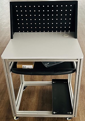 鋼鋁結(jié)構(gòu),裝有4只萬(wàn)向輪,裝有黑色鋼質(zhì)網(wǎng)孔電腦后靠、鍵盤托、主機(jī)支架。