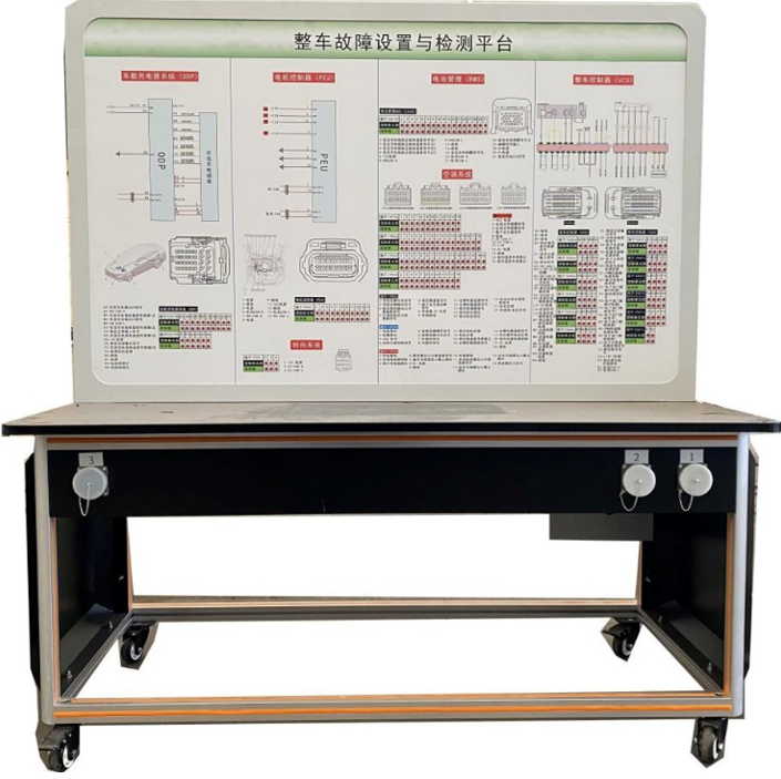 新能源整車故障設(shè)置與檢測(cè)連接平臺(tái)采用純電動(dòng)汽車原車插接器實(shí)物制作,包括電機(jī)控制MCU、電池電控BMSVCU控制、車載充電系統(tǒng)、空調(diào)系統(tǒng)、轉(zhuǎn)向系統(tǒng)插接器及專用線束,通過(guò)專用線束與車輛連接,可直接在檢測(cè)臺(tái)面板上檢測(cè)系統(tǒng)電路元件的電信號(hào),如電阻、電壓、電流、頻率信號(hào)等,可完成電動(dòng)汽車整車控制及驅(qū)動(dòng)傳動(dòng)系統(tǒng)(電機(jī)控制MCU、電池電控BMSVCU控制、車載充電系統(tǒng)、空調(diào)系統(tǒng)、轉(zhuǎn)向系統(tǒng))相關(guān)的實(shí)驗(yàn)實(shí)訓(xùn)內(nèi)容。