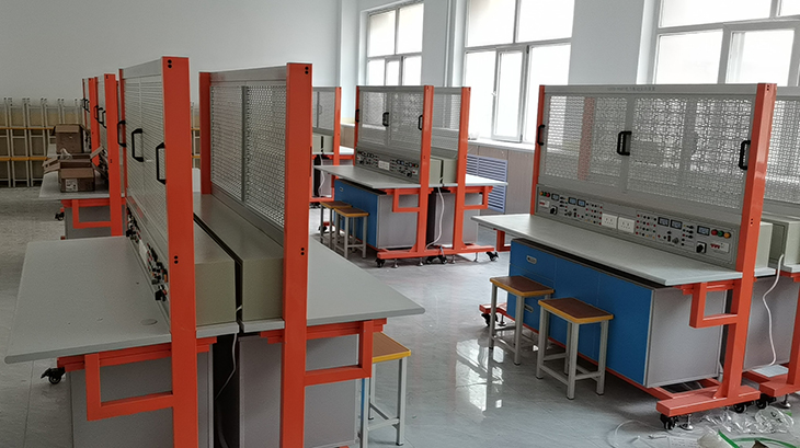 2、實(shí)訓(xùn)桌桌面采用25mm麻灰色高密度層壓板封邊特制,有效提高絕緣等級(jí);實(shí)驗(yàn)桌底部裝有至少4個(gè)導(dǎo)向輪,方便實(shí)訓(xùn)臺(tái)架移動(dòng);