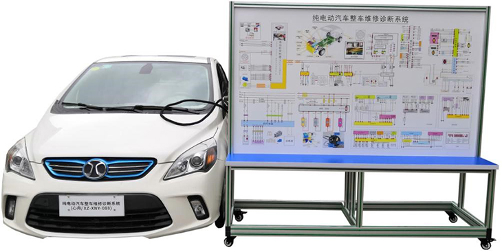 新能源汽車綜合實訓設備將一臺可正常運行的北汽EV160 電動車改裝為在線檢測教具車,可實時檢測與診斷電機控制單元、VCU控制單元、高壓電池ECU控制單元、車載充電系統(tǒng)單元與ABS及空調(diào)控制單元等的動、靜態(tài)信號參數(shù)。適用于各院校對電動車整車理論和維修實訓的教學需要。