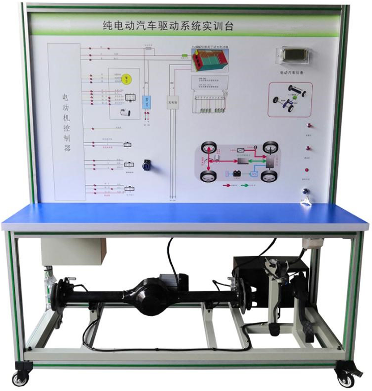 檢測(cè)控制面板(裝有各種檢測(cè)端子,1448×940mm彩色電路圖和工作原理示意圖)、組合儀表、點(diǎn)火開(kāi)關(guān)、電機(jī)控制器、車載充電器與充電接口、DC-DC轉(zhuǎn)換器、鋰動(dòng)力電池組、電動(dòng)車電機(jī)(直流無(wú)刷電機(jī))與變速箱、后輪左右液壓制動(dòng)裝置、驅(qū)動(dòng)橋傳動(dòng)裝置、剎車開(kāi)關(guān)、檔位開(kāi)關(guān)、油門控制裝置、大電流繼電器、電源總開(kāi)關(guān)、急停開(kāi)關(guān)、輔助蓄電池(12V45AH)、一體化全鋁合金型材搭建的移動(dòng)臺(tái)架(1500×700×1700mm (帶自鎖腳輪裝置,帶安裝檢測(cè)端子的原理面板,面板1448×940mm)、故障考核系統(tǒng)、設(shè)備操作說(shuō)明書(shū)。