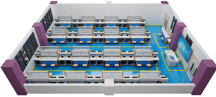 2、實訓(xùn)桌桌面采用25mm麻灰色高密度層壓板封邊特制,有效提高絕緣等級;實驗桌底部裝有至少4個導(dǎo)向輪,方便實訓(xùn)臺架移動;