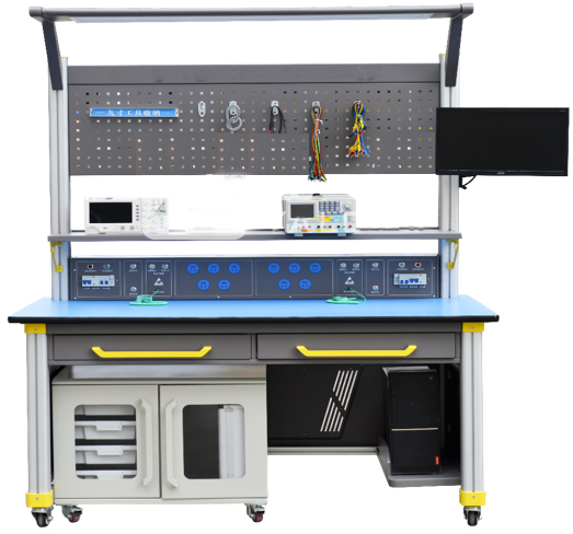 該設(shè)備主要由工作臺(tái)、實(shí)訓(xùn)屏、實(shí)訓(xùn)屏模塊、工具柜、電路實(shí)訓(xùn)模塊