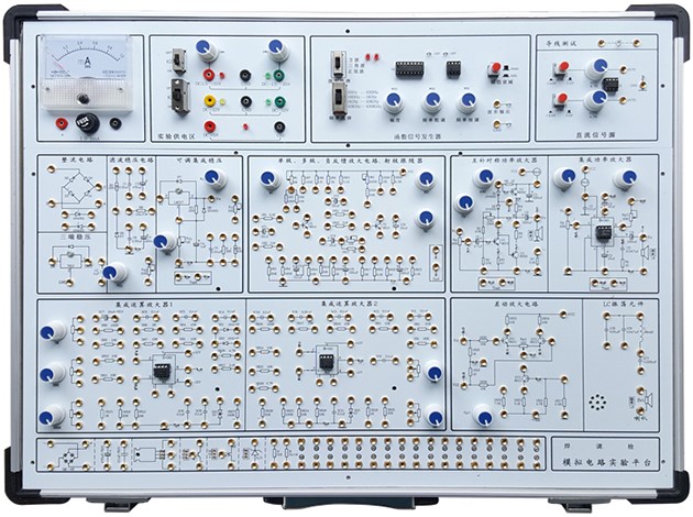 模擬電子技術實驗箱由鋁木合金箱體、高性能線性電源、和實驗電路板組成。其中實驗電路采用固定功能模塊方式,電路原理和元器件符號清晰,實驗用元器件可以焊裝在線路板的反面,安全可靠,不易損壞,也可以裝在線路板的正面,元件直觀可見,感性認識強,正面還有實驗電路原理圖,使學生在實驗時對原理一目了然。
