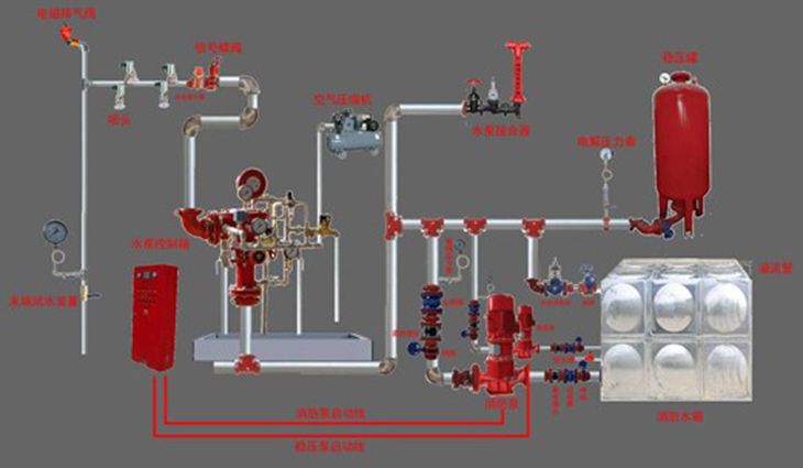 預(yù)作用系統(tǒng)克服了濕式和干式兩種系統(tǒng)的缺點,兼容了兩者的優(yōu)點,具有報警早,噴水快,功能全和適用范圍廣且能在噴頭動作前發(fā)出火警警報。
