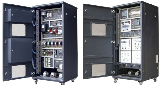 該種維修電工教學(xué)柜式實(shí)訓(xùn)考核裝置,包括有柜架、觀察窗、儀表操作盤、電氣系統(tǒng)、電機(jī)機(jī)組組成,所說的電氣系統(tǒng)由多個(gè)部分前后面板縱向展開排列,包括觸摸屏部分、PLC主機(jī)部分、變頻器部分、電力電子部分、直流電源部分、電力拖動(dòng)與繼電控制部分,電機(jī)軸功率、力矩、轉(zhuǎn)速測(cè)量部分,交直流電壓、電流,單三相交流電能、交流功率、功率因數(shù)測(cè)量部分等組成。