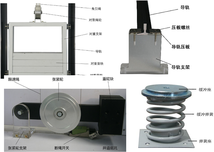 電梯井道部分:導(dǎo)軌、對重機(jī)構(gòu)、轎廂(門機(jī)機(jī)構(gòu)、安全鉗、導(dǎo)靴、照明燈、風(fēng)扇)、層門、樓層召喚指示控制器、曳引繩、導(dǎo)向輪、一層平層感應(yīng)器(計(jì)數(shù)復(fù)位)、上(下)限位開關(guān)、上(下)極限開關(guān)、隨行電纜、轎廂控制器、緩沖器。