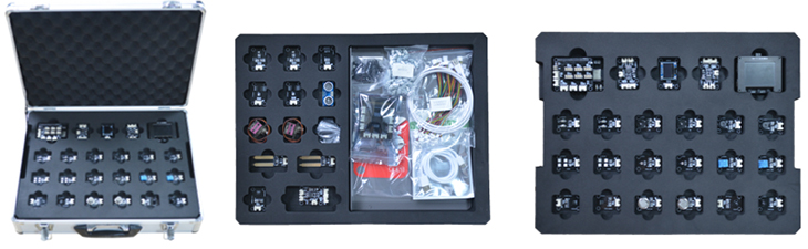 模塊包含LED燈模塊、按鍵模塊、RGB彩燈模塊、蜂鳴器模塊、人體感應(yīng)傳感器、光敏傳感器、溫度傳感器、濕度傳感器、OLED顯示模塊、模擬量傳感器、直流電機模塊、氣壓傳感器模塊等十五余種模塊、傳感器通過4P連接線連接到通用擴展板。