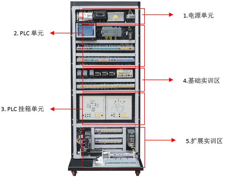 實(shí)訓(xùn)單元組成:網(wǎng)孔板實(shí)訓(xùn)區(qū)主要由電源單元、PLC單元、PLC學(xué)習(xí)箱單元、基礎(chǔ)實(shí)訓(xùn)單元、小車(chē)運(yùn)動(dòng)單元、變頻器單元等組成。