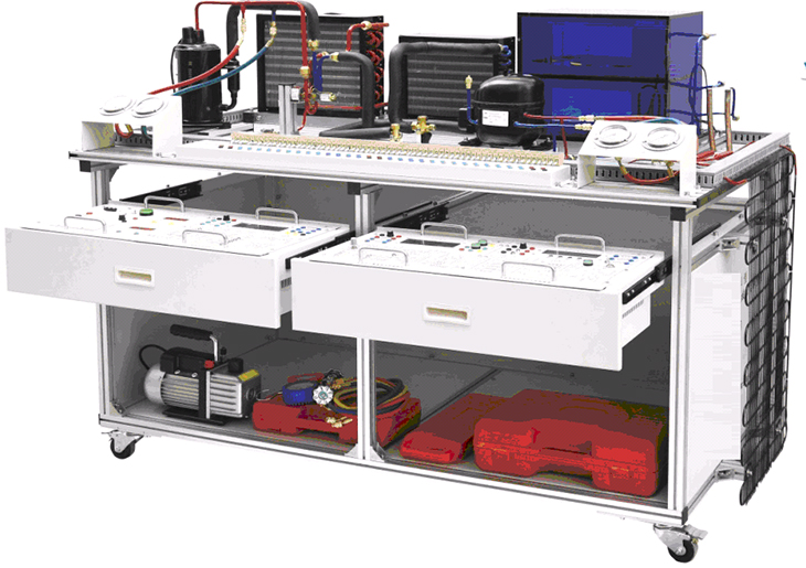 制冷制熱實訓考核裝置是專門為職業(yè)院校制冷類相關專業(yè)而研制的實訓裝置,根據(jù)制冷類行業(yè)中空調與冰箱維修技術的特點,針對空調和冰箱的電氣控制以及制冷系統(tǒng)的安裝與維修進行設計,強化了學生對空調冰箱系統(tǒng)管路的安裝、電氣接線、工況調試、故障診斷與維修等綜合職業(yè)能力。裝置融合了流體力學、熱力學、傳熱學和電氣控制等技術,集制冷空調系統(tǒng)安裝、冰箱系統(tǒng)安裝、制冷系統(tǒng)電接線、壓力檢漏、抽真空、充注制冷劑與運行調試于一體,包含了制冷系統(tǒng)維修的全部步驟,能滿足實訓教學、實際工程訓練及職業(yè)技能競賽的需要。