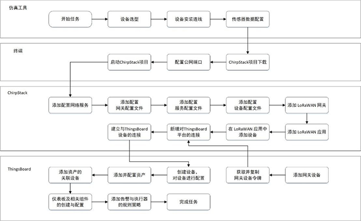 模擬智慧牧場系統(tǒng)還引入使用開源軟件平臺ChirpStack與ThingsBoard,結(jié)合LPWAN技術(shù),實現(xiàn)遠程低功耗數(shù)據(jù)采集、上報和展示。在ChirpStack平臺上,用戶可對網(wǎng)關(guān)、GPS、溫濕度傳感器等設(shè)備進行配置,以上送仿真實驗中的虛擬數(shù)據(jù)。在ThingsBoard平臺上,設(shè)置牧場地圖、告警信息、溫濕度等各儀表盤組件;獲取仿真設(shè)備上送的數(shù)據(jù),并將數(shù)據(jù)以圖表形式作可視化呈現(xiàn);以及基于流式編程添加相應的規(guī)則策略,最終完成模擬智慧牧場實訓場景的部署搭建。