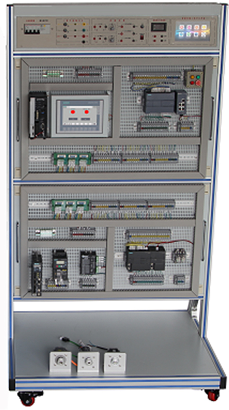 采用立式網(wǎng)孔板結(jié)構(gòu),由工業(yè)鋁型材搭建而成,上方為電源控制模塊,下方為網(wǎng)孔式安裝板。底部設(shè)有帶剎車(chē)萬(wàn)向輪,方便移動(dòng)布局。臺(tái)架尺寸約為1000×800×1800mm。 頂端電源模塊,提供實(shí)訓(xùn)所需的三相交流380V、單相220V電源接口,具有啟動(dòng)、停止、急停系統(tǒng),設(shè)有漏電保護(hù)、電源指示、過(guò)流保護(hù)等功能。設(shè)有DC24V控制電源,配有控制開(kāi)關(guān)及輸出接口,帶短路保護(hù)功能。 |