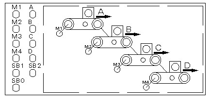 A、B、C、D為故障模擬按鈕,分別模擬M1、M2、M3、M4發(fā)生故障時的情況。例如:當(dāng)要模擬M1條皮帶機發(fā)生故障時,只需按下按鈕A即可,此時該皮帶機立即停止工作,而該皮帶機以后的皮帶機分別間隔5秒再依次停止工作:M2在M1停止工作后5秒以后再停止(將本皮帶上的貨物運送待運完后才停止)。M3在M2停止工作后5秒以后再停止。往后依次類推。當(dāng)M2發(fā)生故障時,M1皮帶機立即停止工作,而M2以后的皮帶機則依次間隔5秒以后再停止工作。M3、M4發(fā)生故障時情況與此相同。