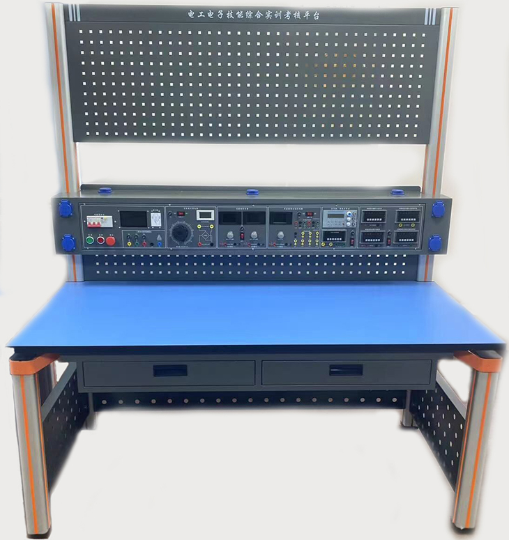 電工電子技能綜合實訓裝置由實驗主機箱、儀器架、實訓桌、移動矮柜、電工電子實訓套件、學生凳等組成。實驗裝置支架與實驗桌可組合、可拆裝。支架與桌腳一體,鋁合金結構。