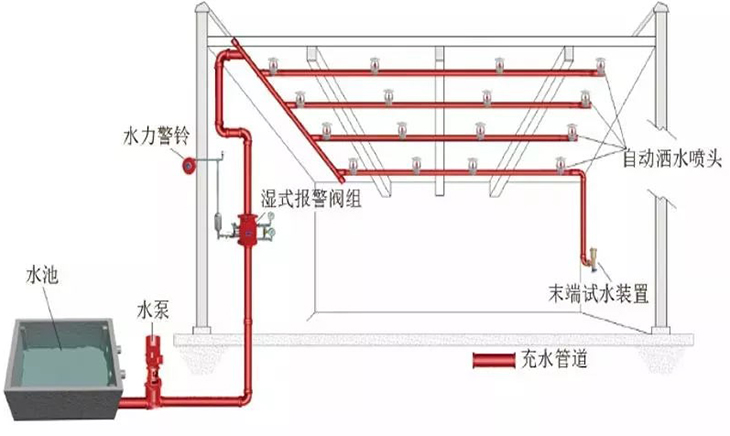 4、 濕式系統(tǒng)在準(zhǔn)工作狀態(tài)時管道內(nèi)充滿用于啟動系統(tǒng)的有壓水的閉式系統(tǒng),濕式系統(tǒng)由閉式噴頭、濕式報警閥組、水流指示器或壓力開關(guān),供水設(shè)施及供水配水管道等消防器材組成。
