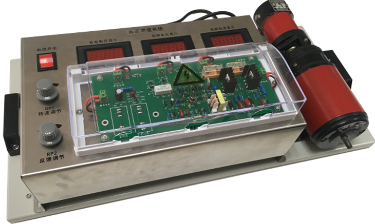 模塊底板采用優(yōu)質(zhì)Q235冷軋鋼板經(jīng)折彎后焊接而成,表面靜電噴塑處理。底板上裝有兩個(gè)黑色鑄鋁拉手,方便搬運(yùn)。底板上方有直流電機(jī)、測(cè)速發(fā)電機(jī)、直流調(diào)速線路板、顯示系統(tǒng)等組成。該模塊采用測(cè)速發(fā)電機(jī)反饋電壓和給定電壓形成閉環(huán)調(diào)速系統(tǒng),調(diào)速系統(tǒng)由給定電壓、轉(zhuǎn)速負(fù)反饋、放大電路、觸發(fā)產(chǎn)生電路及主電路組成。學(xué)員根據(jù)功能要求進(jìn)行測(cè)量分析,完成故障診斷與排除。