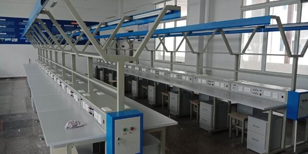 實(shí)訓(xùn)臺(tái)上提供日光燈(用于照明)2個(gè),透明的PVC板4個(gè),可夾放原理圖等資料,另外還配備三芯雙聯(lián)暗插座4個(gè)、兩芯暗插座2個(gè)、工具柜2個(gè),工作臺(tái)面設(shè)有綠色防靜電桌墊,整個(gè)裝配線安全可靠。