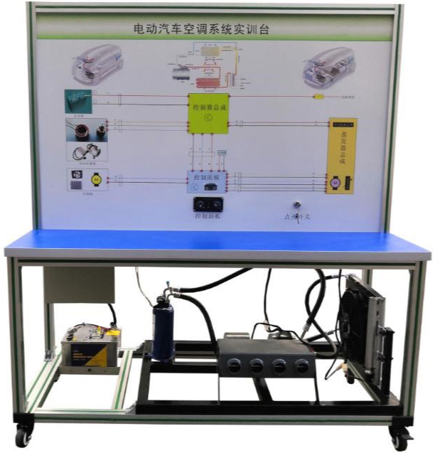 點火開關、電動汽車空調(diào)壓縮機、膨脹閥總成、干燥器總成、鼓風機總成、冷凝器、冷卻電子風扇、電動空調(diào)壓縮機控制器總成、空調(diào)蒸發(fā)箱總成、充電器與充電接口、充電插線、DC-DC轉(zhuǎn)換器、鋰電池組、空調(diào)操作面板、高低壓空調(diào)壓力表、采暖模塊總成、電源總開關、急停開關、直流接觸器、輔助蓄電池(12V45AH)、一體化全鋁合金型材搭建的移動臺架(1500×700×1700mm 帶自鎖腳輪裝置,帶安裝檢測端子的原理面板,面板1448×940mm)、故障模擬與排除裝置、設備操作說明書。