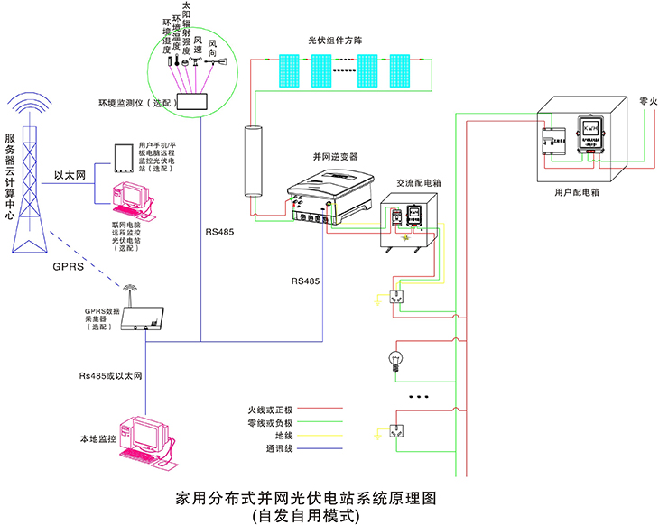 在晴朗的白天,裝在屋頂上的光伏組件發(fā)出的直流電經(jīng)過并網(wǎng)逆變器逆變成與電網(wǎng)同頻率同相位的單相交流電給負載進行供電,在夜晚或陰雨天等太陽光照不足的情況下,系統(tǒng)處于待機狀態(tài),負載用電全部來自電網(wǎng)。您可以通過系統(tǒng)監(jiān)控軟件來實時查看系統(tǒng)的運行狀態(tài)和故障信息,或者是選配遠程通訊數(shù)據(jù)采集器,將系統(tǒng)工作數(shù)據(jù)通過GPRS或以太網(wǎng),傳輸?shù)侥氖謾C、平板電腦或任意一臺聯(lián)網(wǎng)的電腦,以便于您遠程實時掌控電站的信息。