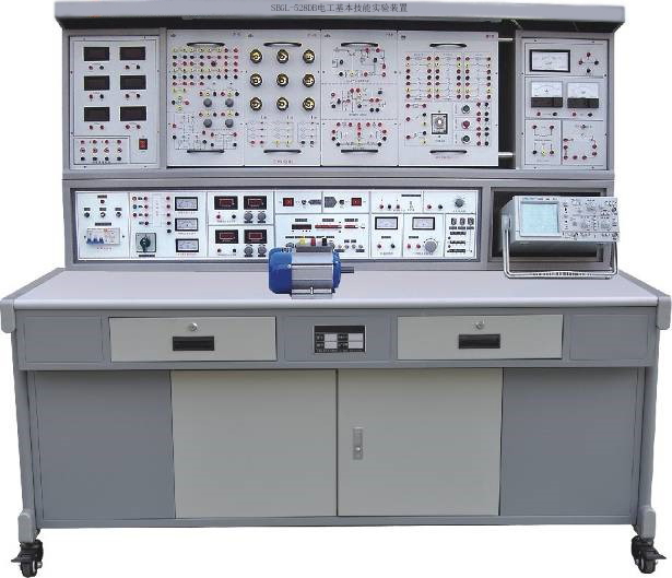 電工基本技能實驗裝置,電工基本技能實驗設備,具有較完善的安全保護措施,較齊全的功能。電工、電氣控制實驗器件采用適應性強的模塊式掛箱;在實驗屏上完成實驗,實驗方法靈活,動手能力強,實驗連線接點接觸可靠,符合不同深度,不同廣度的教學要求。數電、模電在九孔通用電路板掛箱上完成,根據實驗復雜程度選取掛箱個數,根據實驗電路在通用電路板上拼插實驗電路,實驗元件制成透明創(chuàng)新模塊,直觀性好,盒蓋印有永不褪色元件符號,線條清晰美觀。盒體與盒蓋結合采用較科學的壓卡式結構,維修、更換元件拆裝方便。該實驗臺結構合理,學校可隨時按需要增添新的模塊掛箱,靈活、經濟。