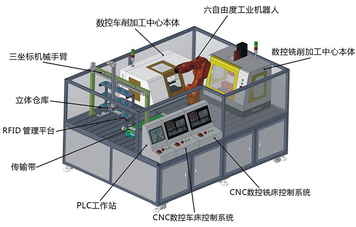 本套設(shè)備是以小型的柔性制造系統(tǒng)為載體,主要特點(diǎn)是占地空間小、操作安全、涉及的知識點(diǎn)豐富、綜合,系統(tǒng)性強(qiáng)、成本低、師生容易上手等;主要是由一臺工業(yè)6軸自由度機(jī)器人、一臺三坐標(biāo)機(jī)械手臂、一臺柔性數(shù)控車床、一臺柔性數(shù)控銑床、RFID系統(tǒng)、PLC工作站、智能倉庫、中控臺、傳輸帶等部份組成,實(shí)現(xiàn)自動化上下料、加工等無人工作環(huán)節(jié),機(jī)器人按指令分別給兩臺機(jī)器送料取料;該系統(tǒng)能夠?qū)崿F(xiàn)工業(yè)機(jī)器人上下料工作站系統(tǒng)的編程、上下料系統(tǒng)的集成、RFID系統(tǒng)應(yīng)用、PLC系統(tǒng)編程、數(shù)控車床編程加工、數(shù)控銑床編程加工、現(xiàn)場總線的通訊實(shí)訓(xùn)等環(huán)節(jié)。讓學(xué)生輕松掌握工業(yè)6軸機(jī)器人上下料與數(shù)控機(jī)床組建柔性加工生產(chǎn)系統(tǒng),能滿足學(xué)生對工業(yè)機(jī)器人學(xué)習(xí)及操作的需要,學(xué)生通過該套系統(tǒng)的學(xué)習(xí)與訓(xùn)練,對智能生產(chǎn)無人工廠的組建整體性應(yīng)用有全面的了解與體驗(yàn)。