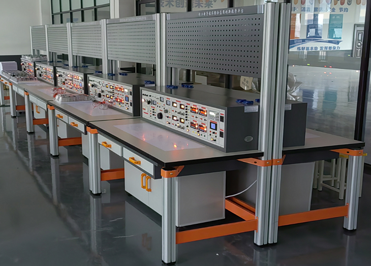 實驗桌規(guī)格為1600(長)*700(寬)*1500(高),實驗桌主體結構全部采用高性能表面氧化的鋁型材及一次成型鋁壓鑄框架連接構件,連接構件采用壓鑄成型工藝(非焊接工藝),經(jīng)機加工、拋丸、噴砂,表面靜電噴涂工藝,安裝方便、快捷,用戶可自行DIY組裝。桌體立柱采用工業(yè)鋁型材成型工藝,表面氧化處理,截面尺寸:70×70mm,四面帶槽,槽寬約8mm,端部配套塑料堵頭。桌面采用25mmE1級三聚氰胺飾面板,桌面板下設支撐框架,承受力不少于200kg。配備儲存柜,存放元件及工具,儲存柜底部4只高強度萬向可制動PU腳輪,方便移動。實訓裝置整體簡約不簡單,高端大氣,符合現(xiàn)代化產(chǎn)品審美和發(fā)展趨勢。