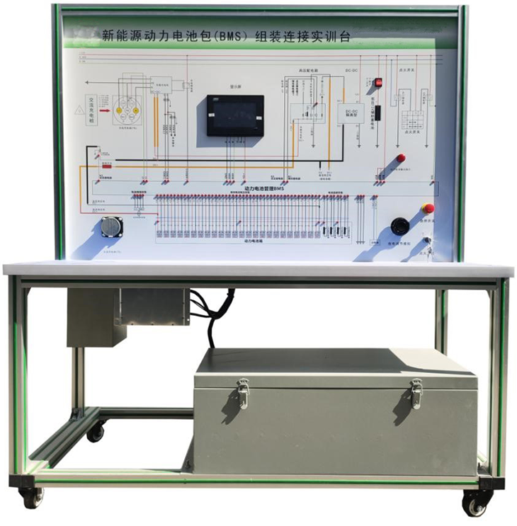 磷酸鐵鋰動力電池包,BMS鋰電管理一體機,動力電池包觸摸顯示屏,充電機,國標充電插口,國標充電槍,緊急斷電開關,霍爾電流傳感器,直流接觸器,DC-DC轉換器,輔助蓄電池,放電控制繼電器與放電負載,電阻,可移動實訓臺(帶檢測端子的原理面板)。