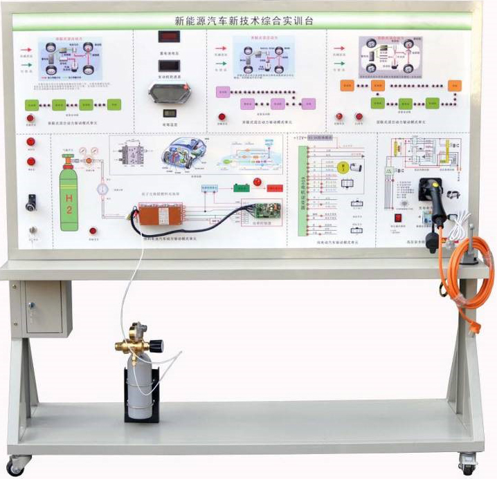 發(fā)電機(jī)、發(fā)動(dòng)機(jī)、燃料電池及運(yùn)行附件、電池組、逆變器、三相交流電機(jī)、傳動(dòng)機(jī)構(gòu)、制動(dòng)機(jī)構(gòu)、故障模擬與考核裝置、檢測(cè)面板與可移動(dòng)臺(tái)架等組成。